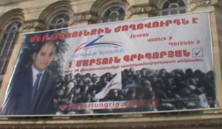 ՀՀ աշխատանքի և սոցիալական հարցերի նախարարության Սոցիալական ապահովության պետական ծառայության Գյումրու սոցիալական ապահովության տարածքային բաժնի շենքի վրա փակցված է «Բարգավաճ Հայաստան» կուսակցության ներկայացուցչի՝ Մարտուն Գրիգորյանի նախընտրական մեծ պաստառը: