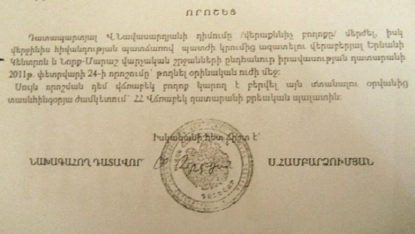 Այս որոշումը Վերաքննիչը կայացրել է 2011թ.-ի մարտի 22-ին՝ անփոփոխ թողնելով Երևանի  Կենտրոն և Նորք-Մարաշ վարչական շրջանների ընդհանուր իրավասության դատարանի որոշումը: