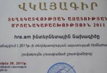 «Ոսկե բանալիներն» ու «ժանգոտ կողպեքները» բաշխված են «Մարդու իրավունքները Հայաստանում» (www.hra.am) կայքը «Ոսկե բանալի» ստացավ 2011թ. տեղեկատվության ազատության հիմնահարցերն ակտիվորեն լուսաբանելու համար... more |