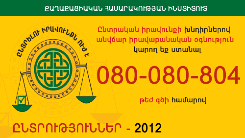 Legal Initiative "Elections 2012" will include more than 90 reporters, lawyers and observers. 30 legal assistance ambulances will be operating: 7 in Yerevan and remaining 23 throughout the regions of Armenia.