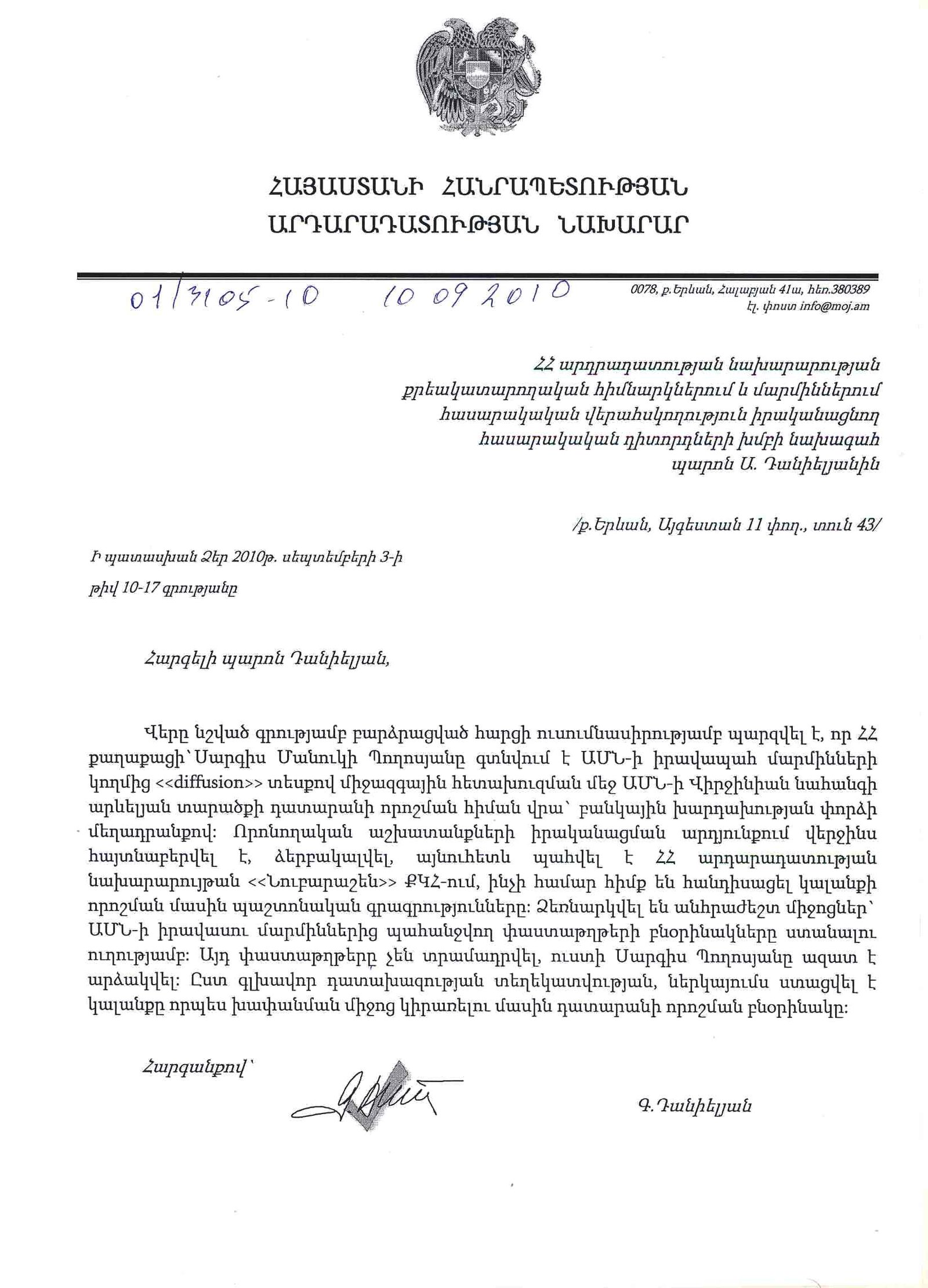 Ի պատասխան Ձեր 2010թ. սեպտեմբերի 3-ի թիվ 10-17 գրությանը