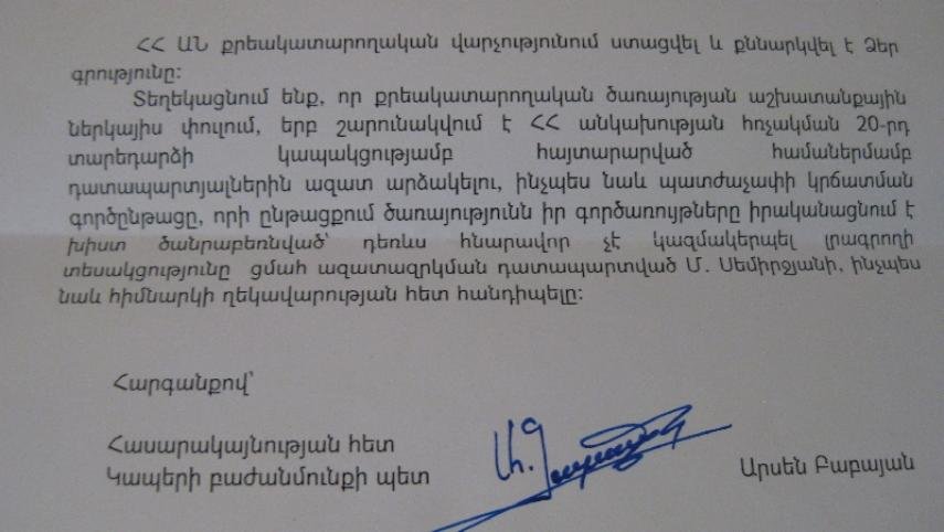 www.hra.am -ին վերջին անգամ մերժել են հունիսի 6-ին՝ պատճառաբանելով, որ չեն կարող ապահովել հարցազրույց ցմահ ազատազրկված Մանուկ Սեմերջյանի հետ, քանի որ ծանրաբեռնված են ՀՀ անկախության հռչակման 20-րդ տարեդարձի կապակցությամբ հայտարարված համաներմամբ դատապարտյալներին ազատ արձակելու, ինչպես նաև պատժաչափի կրճատման գործընթացով։
